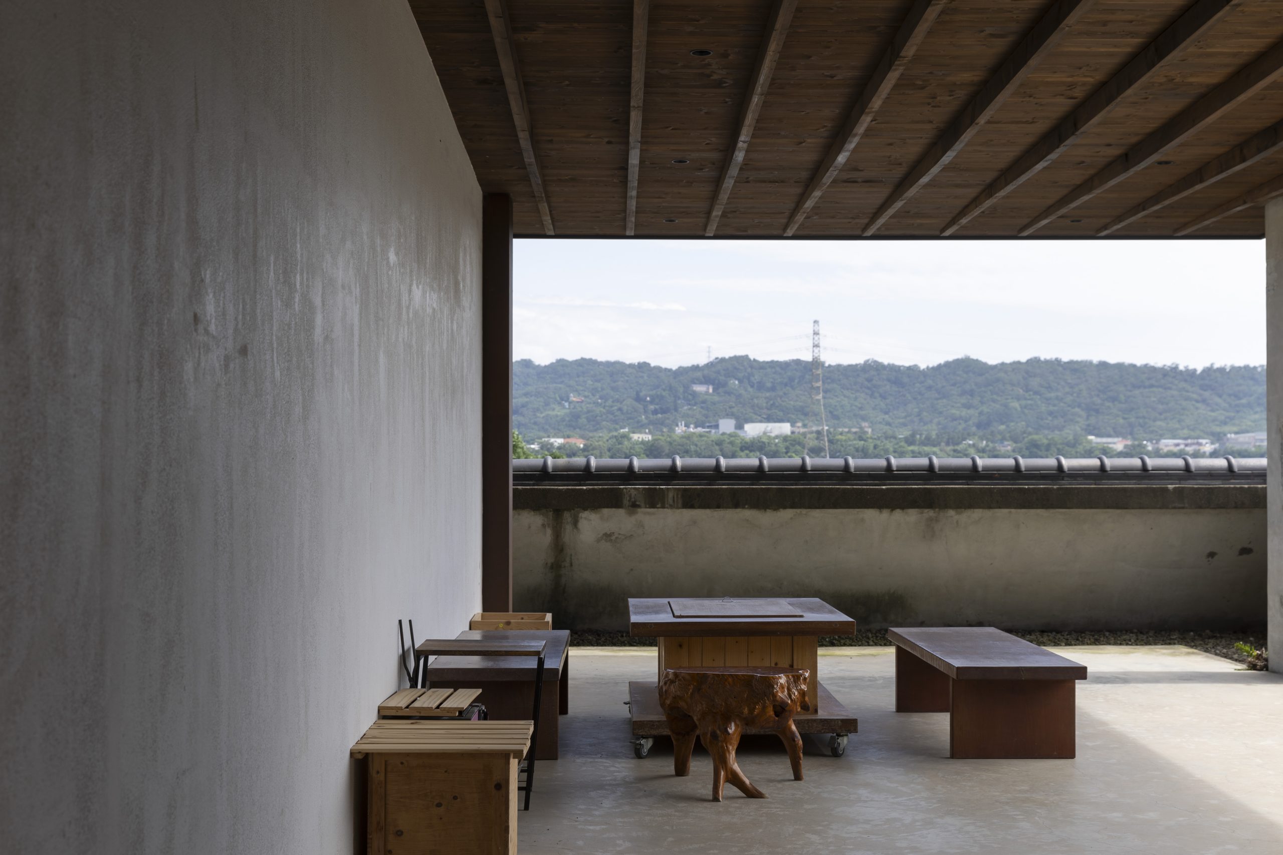 ▴ 鴻梅國際藝術村的頂樓有一處半開放空間,可眺望新埔區域山景,備有火爐與寬椅讓藝術創作者聚集在此,分享駐村生活用。