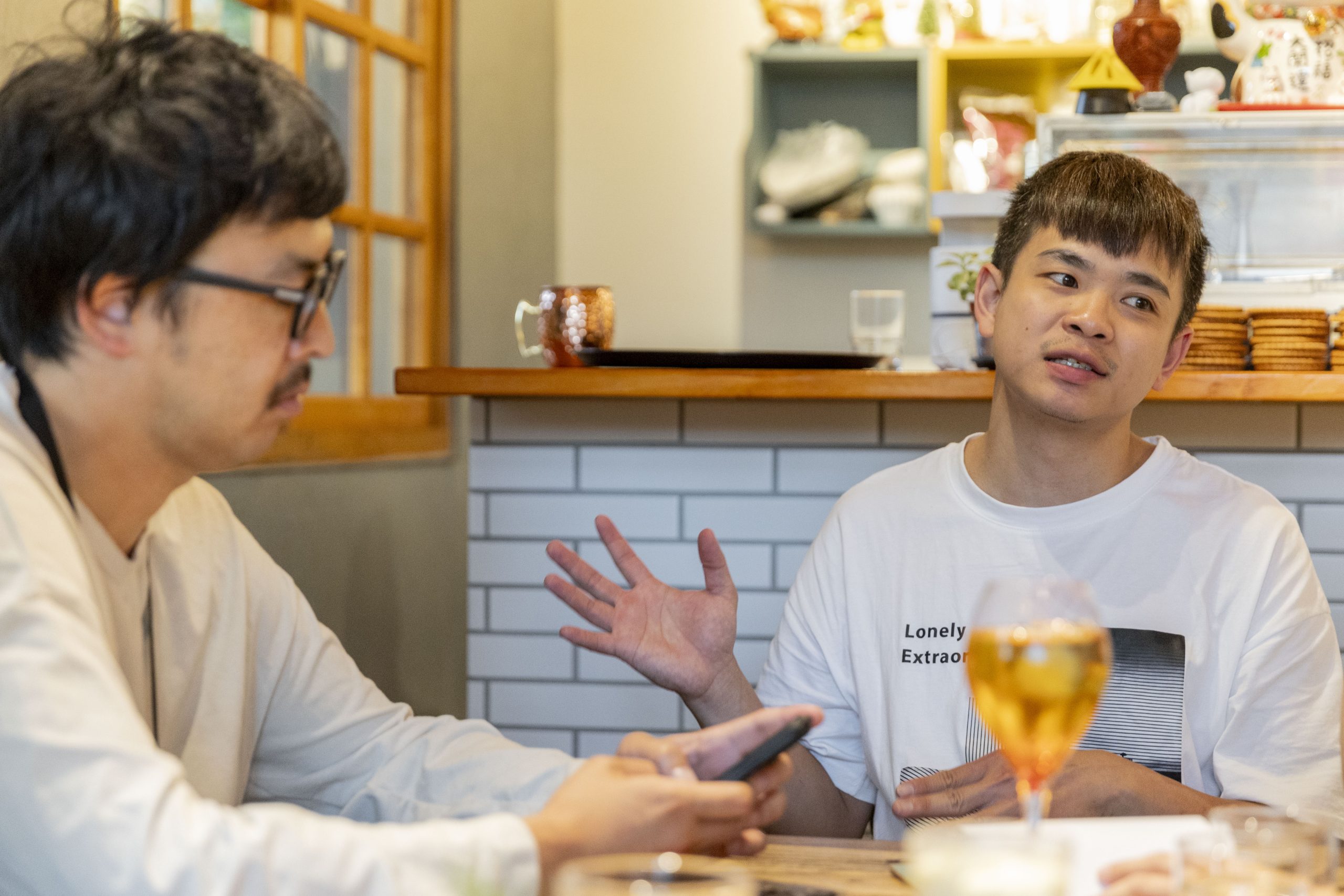 ▴ 近年活絡的將軍村區域適合逛遊,d mark 「在地喝一杯」的「無酉無慮」在行程一開始就被多位在地人推薦。喜愛探訪日本各縣市在地居酒屋的總編神藤,一開始就被其中運用擂茶與東方美人茶的調飲而受到吸引。我跟口譯則同時認為,洗石子地板金魚圖案有標誌性,可以同時點其他店家的食物是很方便的服務。